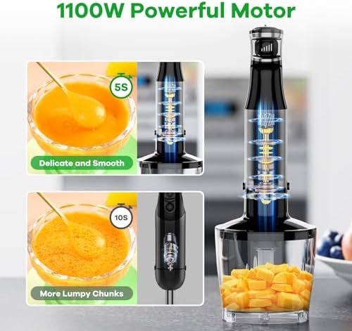 The immersion blender delivers versatile blending performance for any kitchen task. From the first use, this product showcases its ability to puree soups, whip smoothies, and emulsify sauces with minimal effort thanks to the robust 1100W full copper motor.