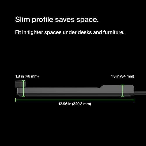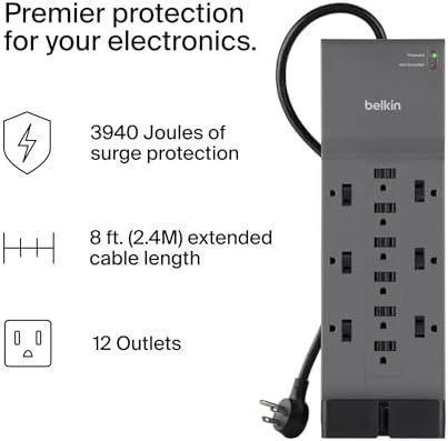 Protect and power all your essential devices with the Belkin 12-Outlet Surge Protector Power Strip. Featuring 3,940 joules of protection and 12 AC outlets, this UL-listed, heavy-duty extension cord safeguards your electronics from surges and overloads while offering ample space for bulky plugs. Its 8ft flat plug fits neatly behind furniture, and the safety indicator light ensures your devices are always secure. Plus, it's sustainably made and backed by a generous 2-year warranty, making it a reliable choice for any home or office setup.