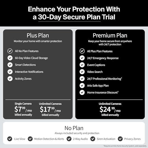 You can use basic functions without a plan, but for person recognition, vehicle alerts, and cloud video storage, an Arlo Secure subscription is strongly recommended.